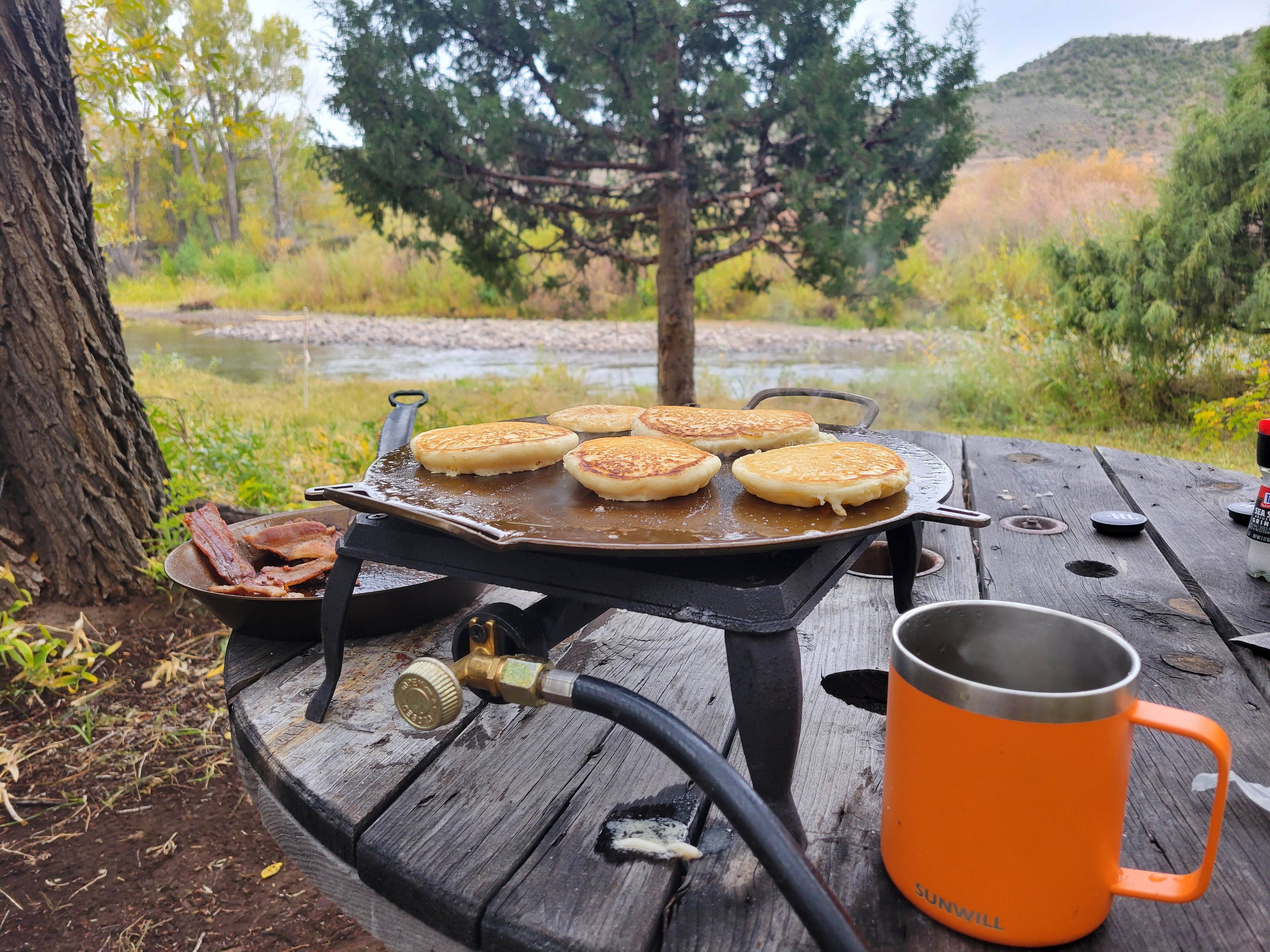 David’s plancha is truly an incredibly well-imagined design. While on legs when used for cooking - much like an antique fire skillet - it deconstructs for storage or transport. The removable leg design has an easy-to-use pin system that insures stability: an important feature when it’s very hot and is supporting your next meal. Last Fall, I was able to get out camping and gave my new plancha a test run. It performed extremely well.